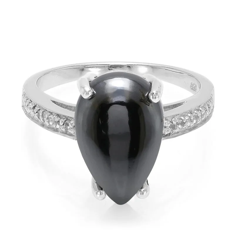 Scoprite il fascino del nostro anello Chic di ematite nera, con uno splendido cabochon a goccia da 7,3 carati proveniente dagli Stati Uniti, graziosamente accentuato da 0,11 carati di topazio bianco scintillante proveniente dal Brasile. Racchiuso in argento sterling 925 di alta qualità, questo pezzo sofisticato esibisce una lucentezza nera senza tempo. Ideale per la sera o per aggiungere un tocco di eleganza al vostro abbigliamento quotidiano, questo anello è sicuro di affascinare e incantare. Abbracciate la sua versatilità e fatelo diventare un punto fermo della vostra collezione.