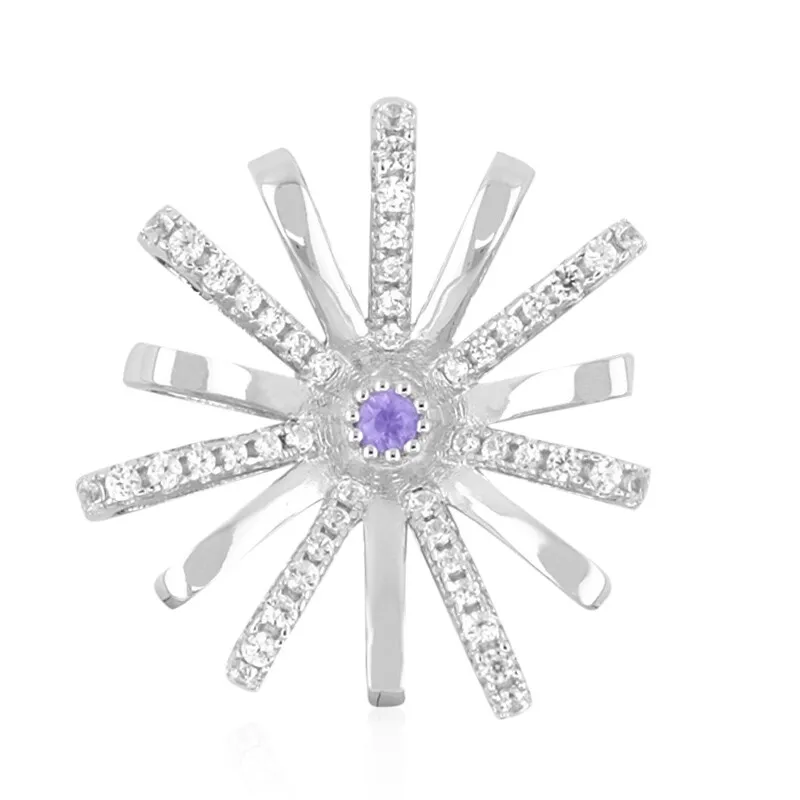 Scoprite il fascino di questo splendido pendente, il cui cuore è costituito da uno zaffiro viola non riscaldato di Ceylon, proveniente dallo Sri Lanka, del peso di 0,057 carati. Circondato da un’aureola di scintillanti zirconi cambogiani del peso complessivo di 0,403 carati, questo squisito pezzo è realizzato in argento sterling 925 di alta qualità. Il design sorprendente ricorda una stella radiosa e lo rende un accessorio straordinario per un abbigliamento sia casual che formale. Questo ciondolo aggiunge un tocco di eleganza a qualsiasi ensemble ed è un must-have per gli appassionati di pietre preziose.