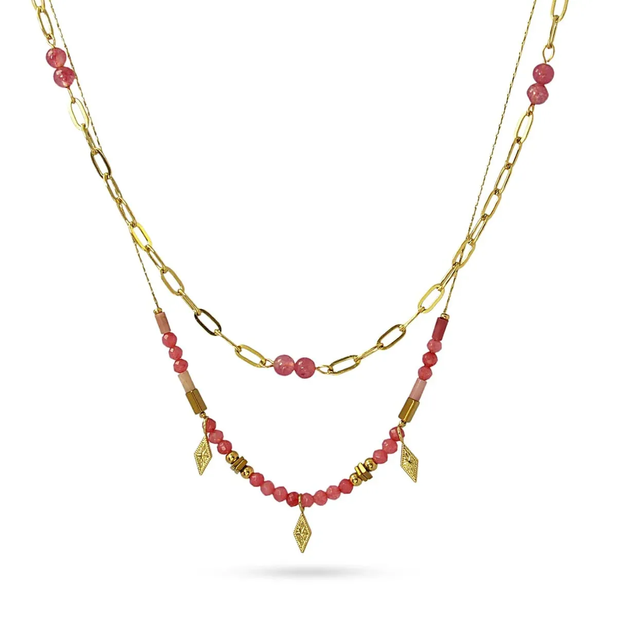 Collana doppio filo in acciaio chirurgico e anallergico con pietre rosa o bianche e pendenti.